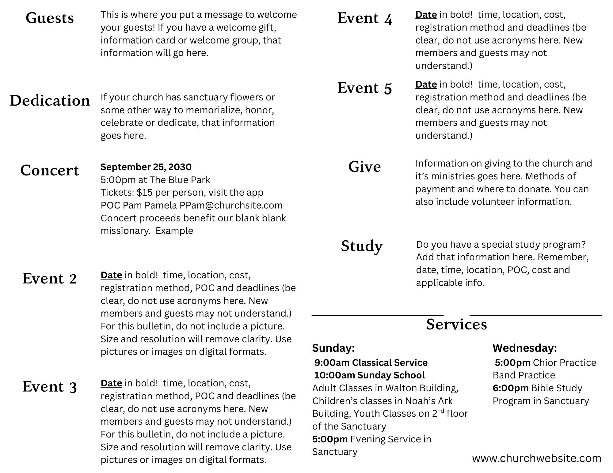 The bulletin has been designed with ease of use and user experience in mind. It fills all the needs and purposes of most bulletins and retains readability. This bulletin uses only one sheet of standard sized printer paper. Reducing the cost of printing for many churches!